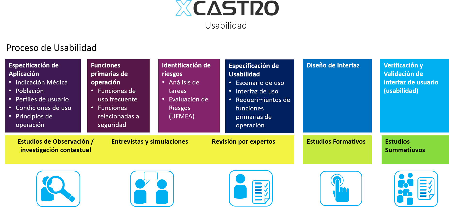 El proceso que seguimos se apega a las regulaciones de FDA y CE (ISO 62366), el cual adaptamos según los requerimientos de nuestros clientes y la estrategia regulatoria que se desea seguir. Tenemos la capacidad y experiencia necesaria para documentar todo el proceso y conducir estudios summativos y formativos en México, Europa y Estados Unidos